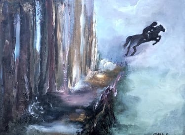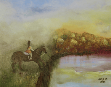 A pintura Voo de Valentina (2025), mede 34 cm X 40cm técnica acrílico está participando da COP 30 pelo Club de Artes, expressa movimento e risco. Um cavalo e sua cavaleira saltam de um penhasco em direção à luz, simbolizando a fuga diante do desmatamento. Inspirada em conto de Mineya da Costa Santos, a obra une realismo e simbolismo em um apelo poético pela preservação da natureza.