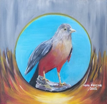 A pintura “Sabiá Laranjeira” (2022), mede 34 cm x 34 cm técnica acrílico está participando da COP 30 pelo Club de Artes, combina realismo e simbolismo ao contrastar o azul da paz e liberdade com tons quentes que representam o aquecimento global. O sabiá, símbolo do Brasil, surge em um portal entre serenidade e ameaça, refletindo a busca por refúgio e esperança diante das mudanças climáticas.